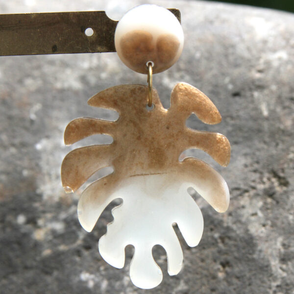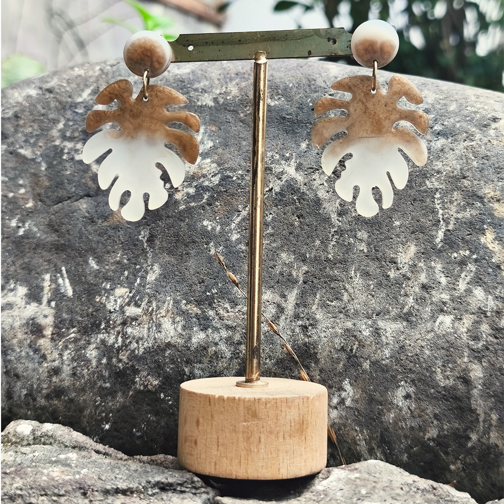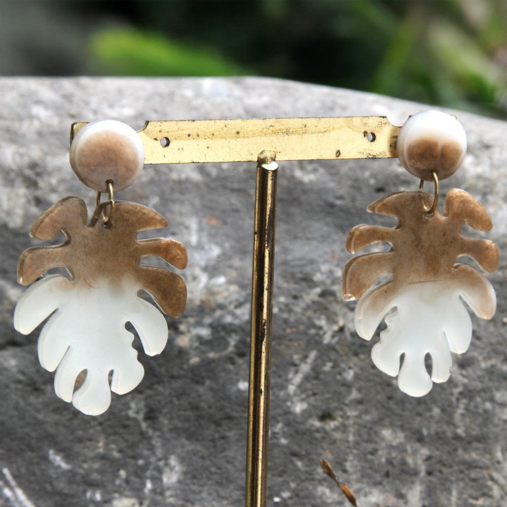 Captura la esencia de la naturaleza con un toque moderno. Estos aretes presentan un diseño de hoja monstera elaborados artesanalmente en resina, luciendo un elegante efecto bitono que fusiona el blanco opaco con un cálido tono ámbar translúcido. El poste superior redondo y los herrajes dorados añaden un acabado sofisticado a esta pieza única.